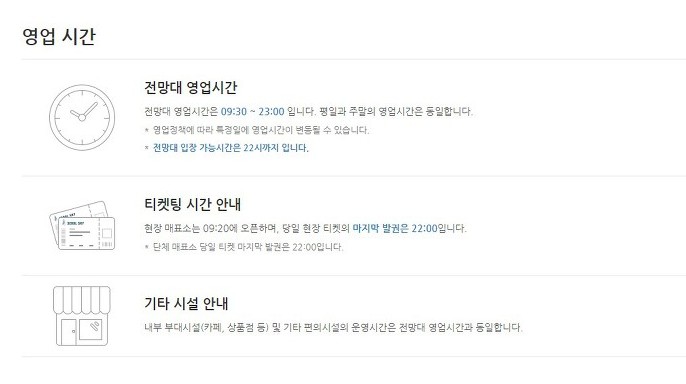 그외에 티켓팅 시간과 함께 기타 시설 내부 부대시설도 이용하실때 운영시간을 보면 전망대 시간과 동일하게 이용하면 된다고 나와잇네요
